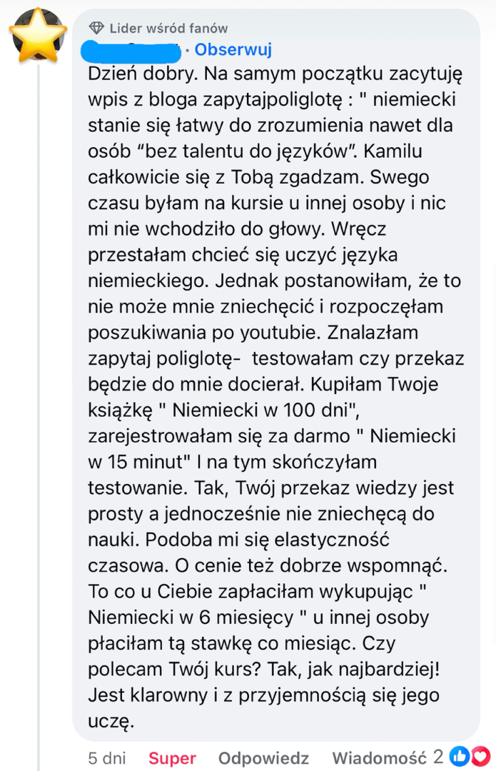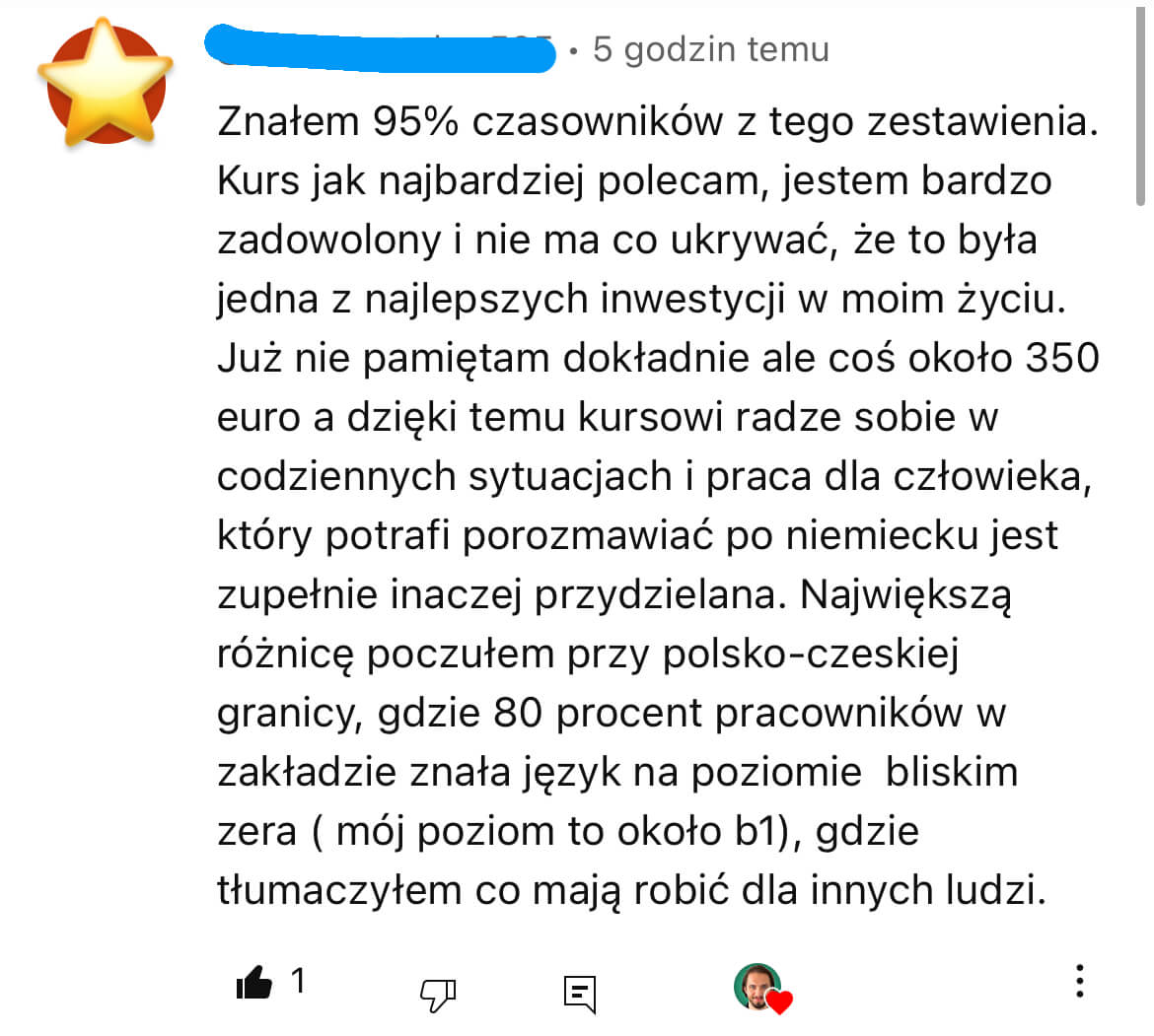 Tak! W ramach kursu otrzymasz wstęp do naszej zamkniętej społeczności na Facebooku, gdzie osobiście odpowiadam na pytania kursantów i gdzie jest wiele innych osób uczących się niemieckiego, na różnym poziomie, które sobie nawzajem pomagają - zarówno wiedzą, jak i motywacją i pozytywną energią.